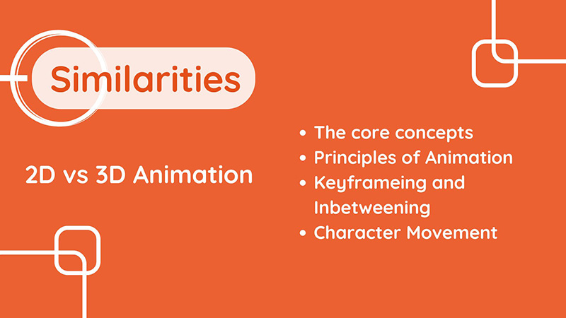 Despite their differences in dimensionality and techniques, both 2 styles rely on principles such as timing, squash and stretch, anticipation, staging, follow-through, and overlapping action. These are essential for animators to create engaging and believable movements.