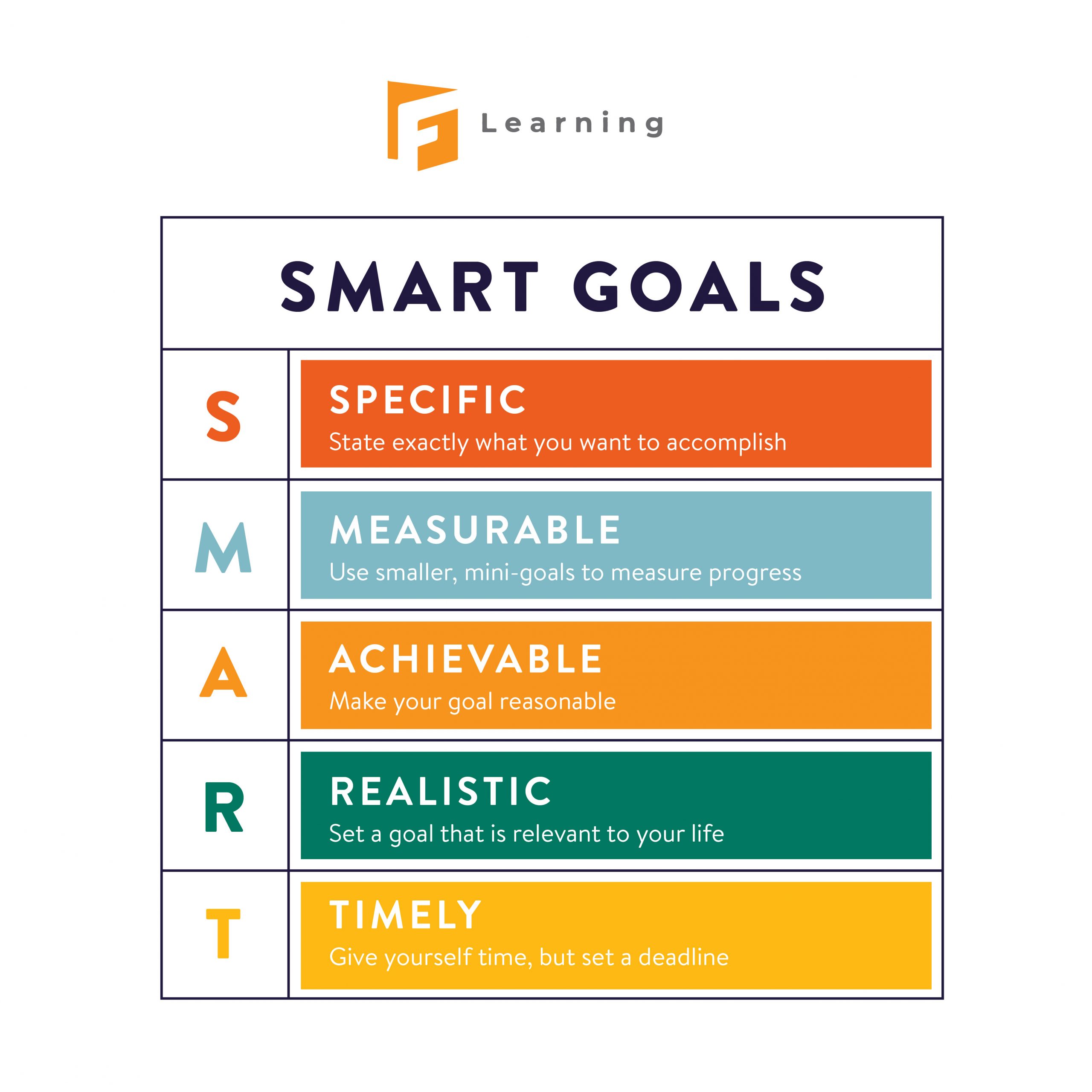 We recommend you establish goals that meet the SMART methodology, including Specific, Measurable, Achievable, Realistic, And Timely. Always make sure that they align with the organization’s overall goals and learning objectives.