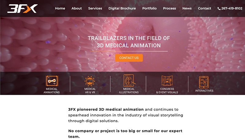 3D for Science is good at medical animation, scientific illustration, interactive applications, virtual reality, and web design. They offer high-quality projects in virtual reality for medical simulations, training, and education.