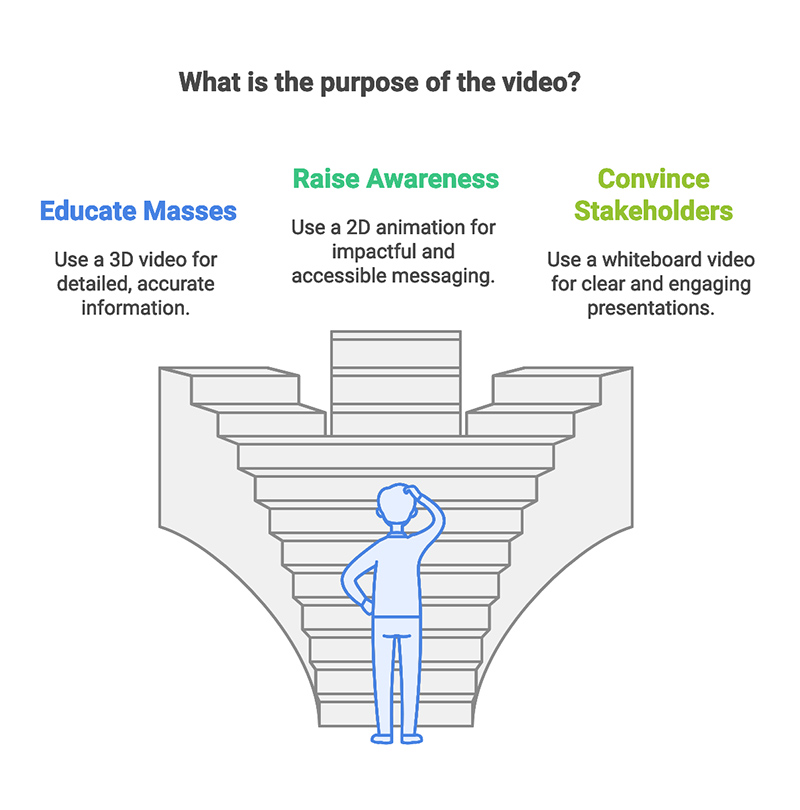 Ask yourself: Is your video to educate the masses? Raise awareness? Or possibly convince stakeholders? If your goal is to provide technical, in-depth education for professionals or scientists, a 3D video allows you to get granular without sacrificing accuracy.