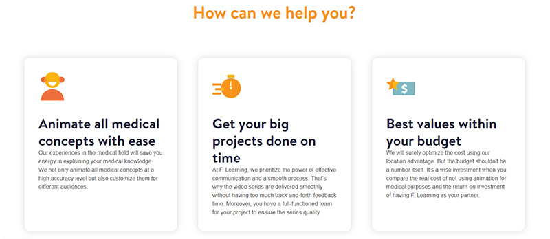 | 1 | F.Learning Studio | Vietnam | – 2D animation – 3D medical animation with flexible prices, including ophthalmology – Interactive, gamified content for surgeries, devices, and patient education. – eLearning Content Development – Learning Design Strategy |